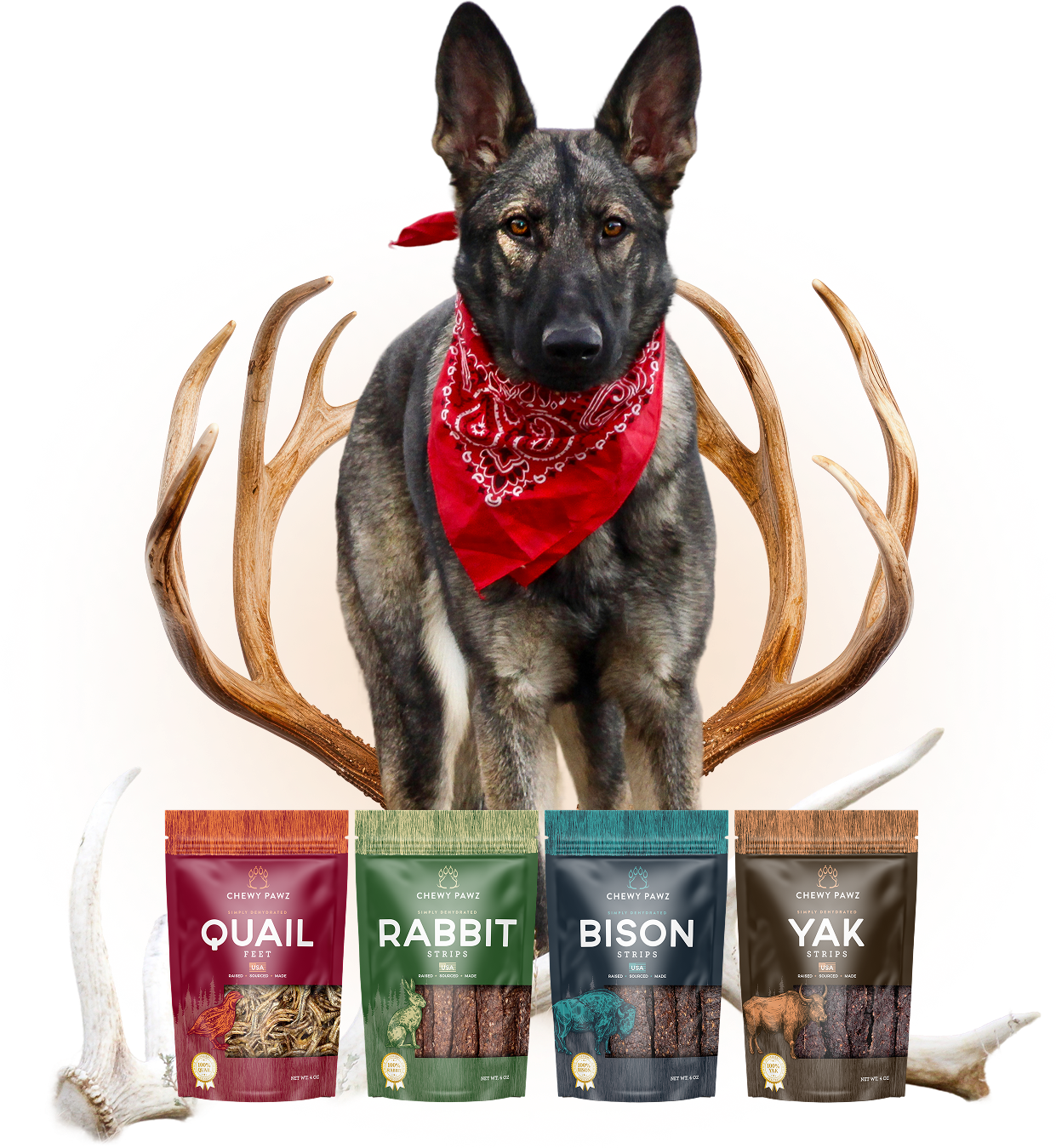 Single ingredient, USA made chews and treats sourced from local farms and wild antlers- no fillers, no junk.